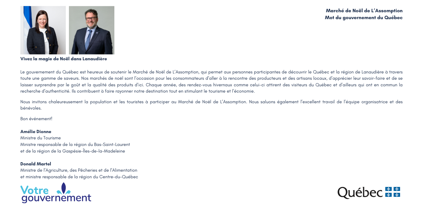 Le Marché de Noël de L’Assomption (OBNL), est né du rêve de ses fondateurs de créer, dans le coquet centre-ville de L’Assomption, un événement hivernal d’envergure et d’inspiration européenne. Grâce à l’appui de ses quatre bâtisseurs que sont la Ville de L’Assomption, le Théâtre Hector-Charland, le Collège de l’Assomption et le Cégep régional de Lanaudière à L’Assomption, l’événement a pu voir le jour en 2009 et s’inscrit maintenant comme un incontournable du temps des Fêtes.